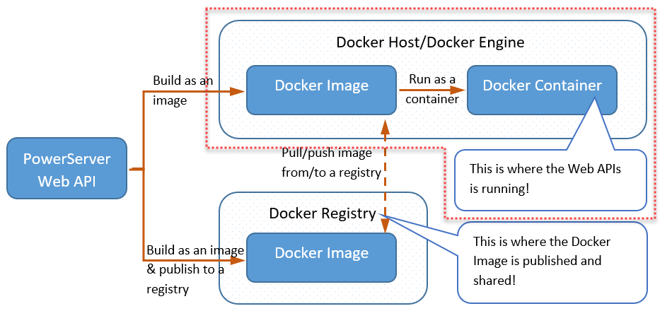 The docker host is where the docker image is built and the docker container is run. The Web API project will be built and published as a docker image first, and then the docker image will be run as a docker container. The Web APIs is actually hosted and run in the docker container.