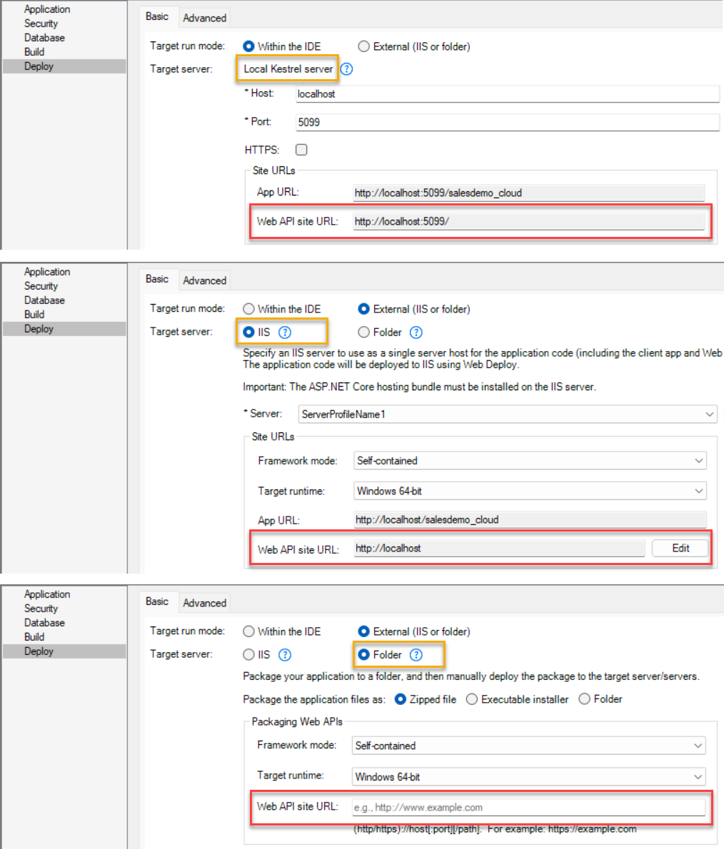 In the Deploy > Basic tab, you can specify the Web API site URL for the application.