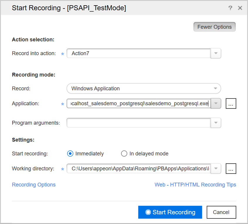 For recording, please fill up the Start Recording dialog similar to the screenshot A provided below. Specifically, for the Application to run the URL, please specify the .exe file of the client app, which you can get by right clicking the desktop shortcut of the app and then copying from the properties > Target field.