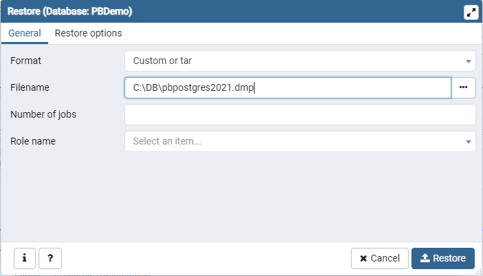 Select the pbpostgres2025R2.dmp file and click Restore.