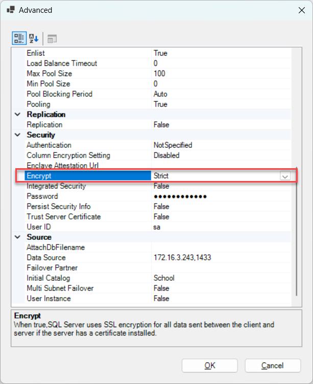 Or specify "encrypt=Strict" in the Applications.json file in the compiled Web API > AppConfig folder (or in the solution > UserExtensions project > AppConfig folder).