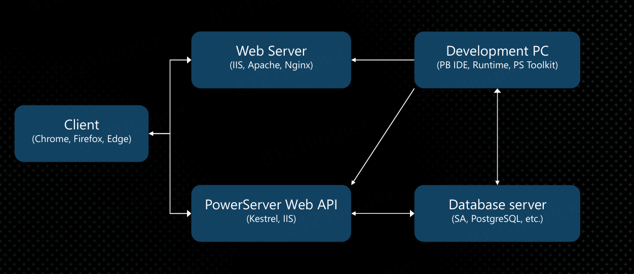 When an error occurs, quickly identifying which component is involved narrows down the possible causes significantly. Note that the Web Server acts purely as a static file server in this architecture; runtime logic errors will trace back to the PowerServer Web APIs or the database, not the web server itself.