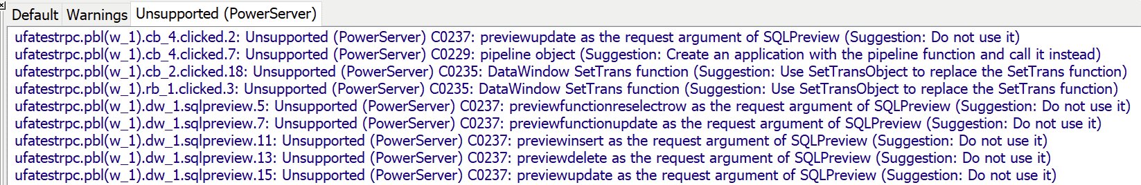 The PowerServer Toolkit “Unsupported Features” window lists affected objects, functions, or properties after the build. At runtime, the unsupported code may be silently ignored (no error shown), return NULL, or produce results that differ from the classic C/S PowerBuilder behavior — with no obvious error message to alert the user.