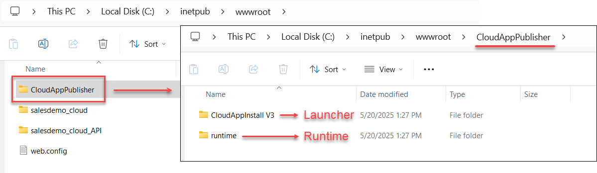 Apps deployed to the same server and directory will use the same app launcher and the same runtime files. There will be only one app launcher in the specified server and directory (although there can be multiple versions of runtime files). The app launcher will be overwritten without notice by the one uploaded later to the same server and directory.