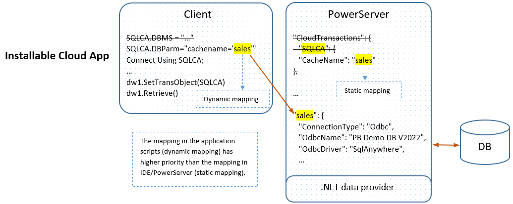 Besides statically mapping the transaction object with the database cache in the IDE or PowerServer, for each transaction object that exists in the application, you can also dynamically map it with the database cache using the DBParm CacheName property. Such dynamic mapping with DBParm has higher priority than the static mapping if both exist.