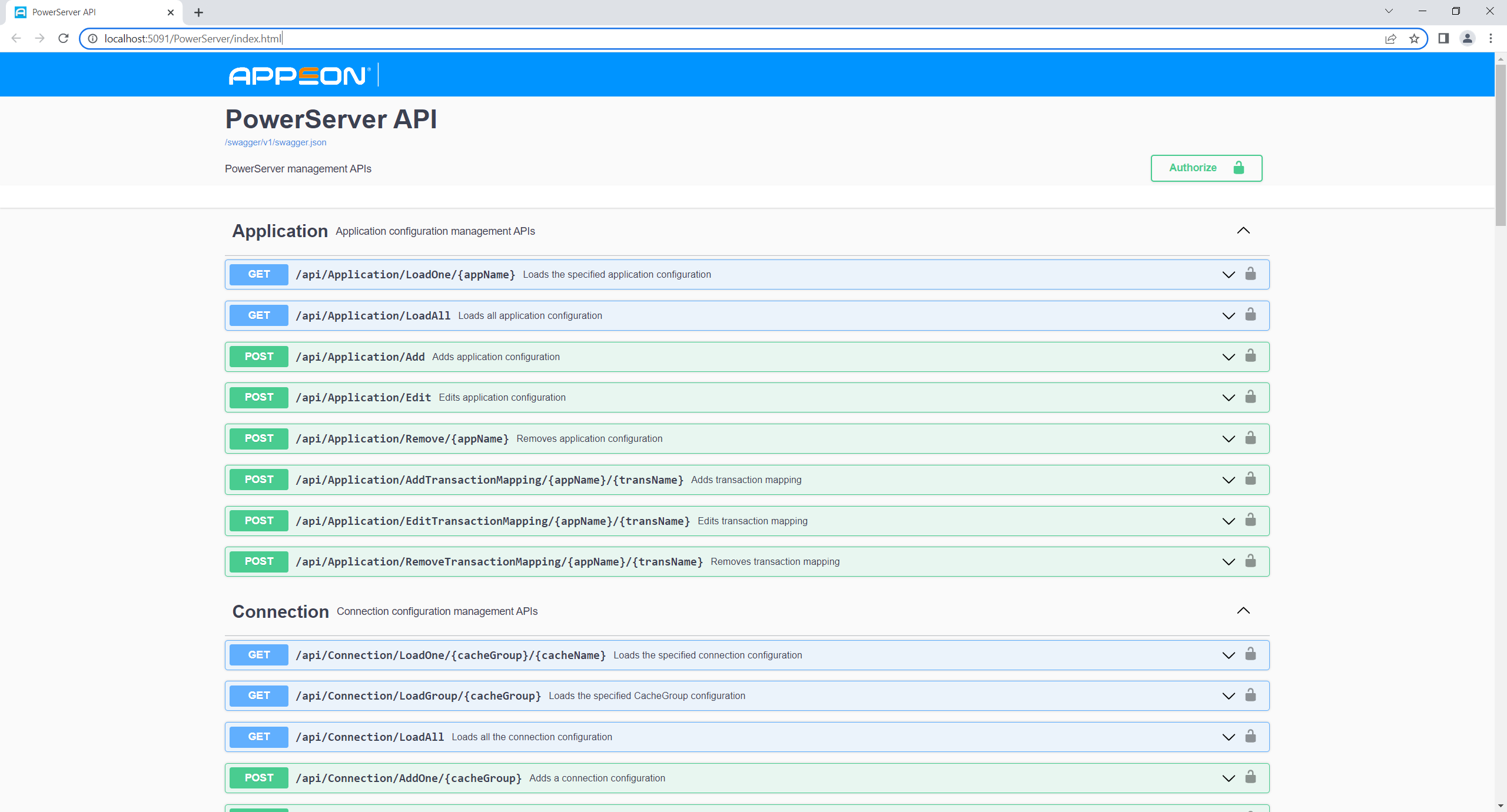 The documentation for PowerServer Management APIs is exposed using Swagger UI. Each API is described with the operations (GET, POST, etc.) and the operation parameters; and developers can directly test the API from Swagger UI.