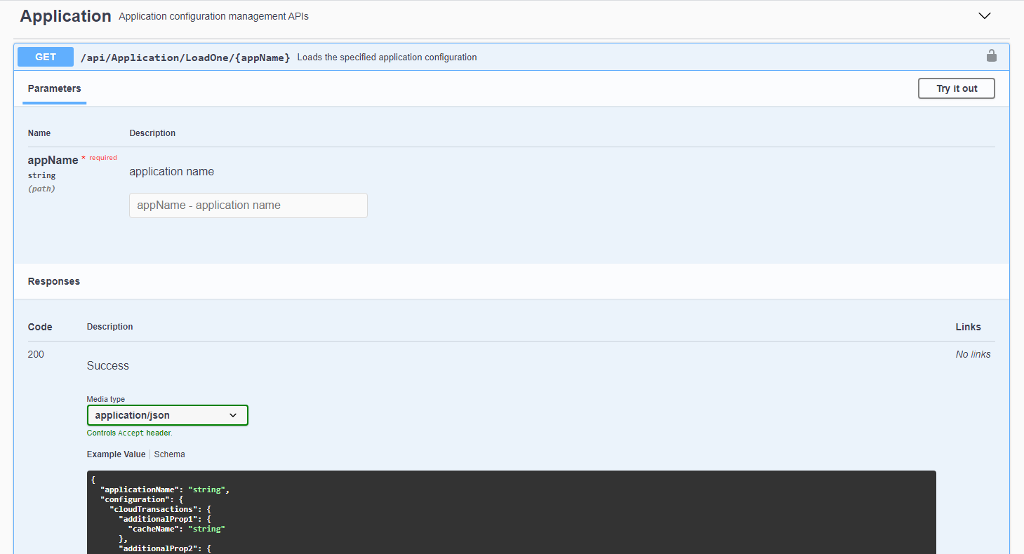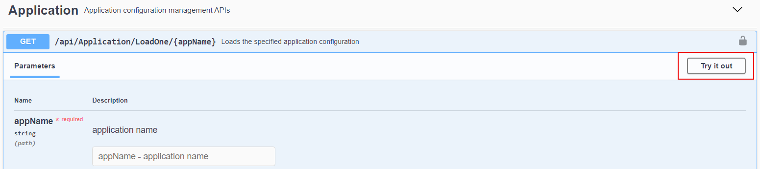 For example, expand /api/Application/LoadOne/{appName}, and then click Try it out.