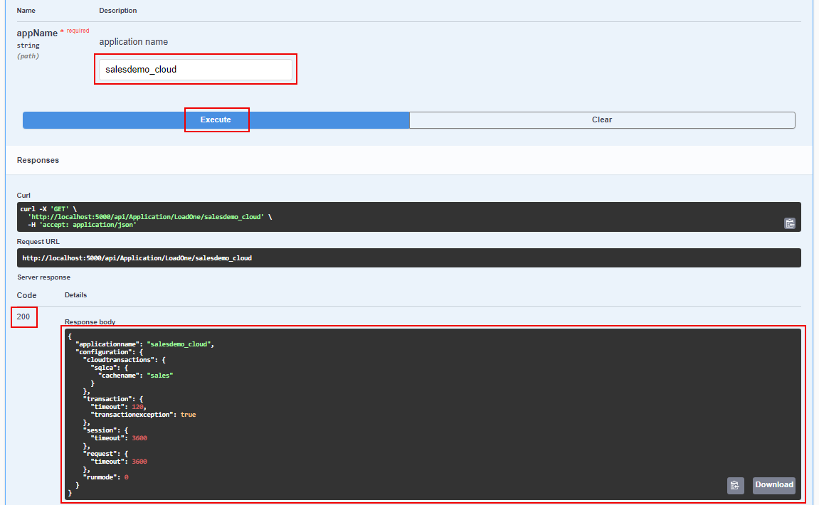 Input the application name (for example, "salesdemo_cloud") as the value of appName, and then click Execute. If execution is successful, the status code 200 and the response body (that contains the application settings) will be displayed.