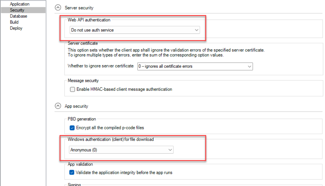 For app file downloads, select the authentication mode under Windows authentication (client) for file download.