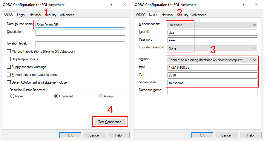 Step 2: Create a 64-bit ODBC data source and name it as "SalesDemo DB". The data source name must be the same in both the development PC and the web server. The data source should connect to the salesdemo SQL Anywhere database server (which is set up in the previous section).