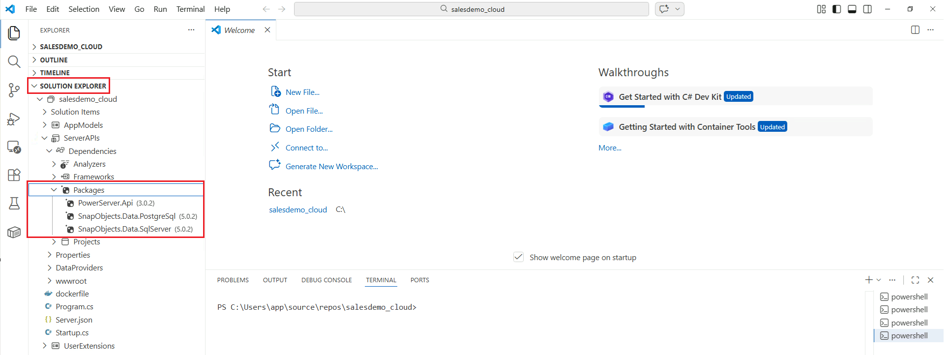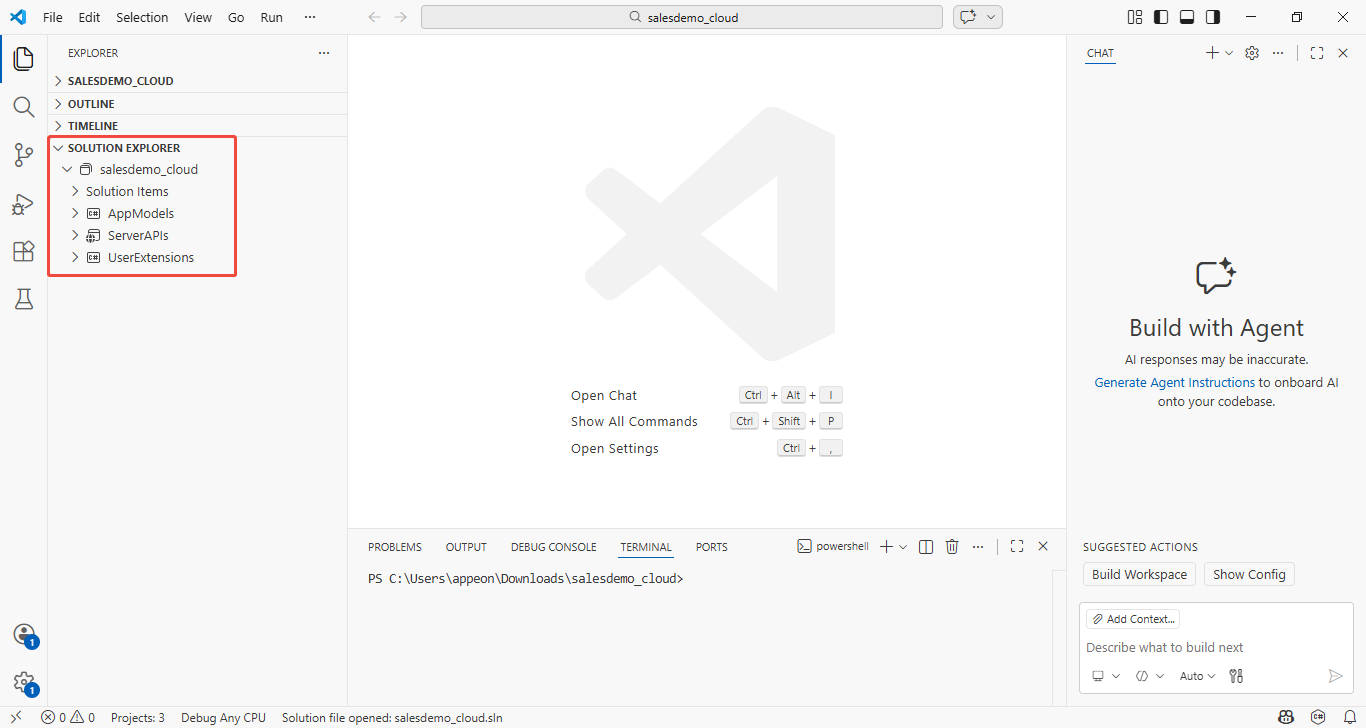 After the folder is opened, the project will be loaded automatically and displayed in the SOLUTION EXPLORER.