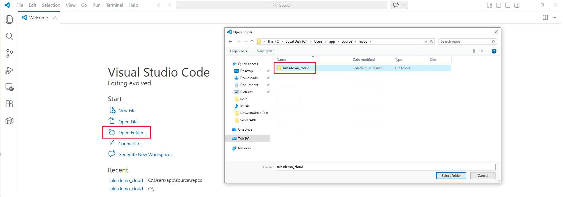 In Visual Studio Code, select Open Folder and choose the Web API solution folder (taking Example Sales App as an example).